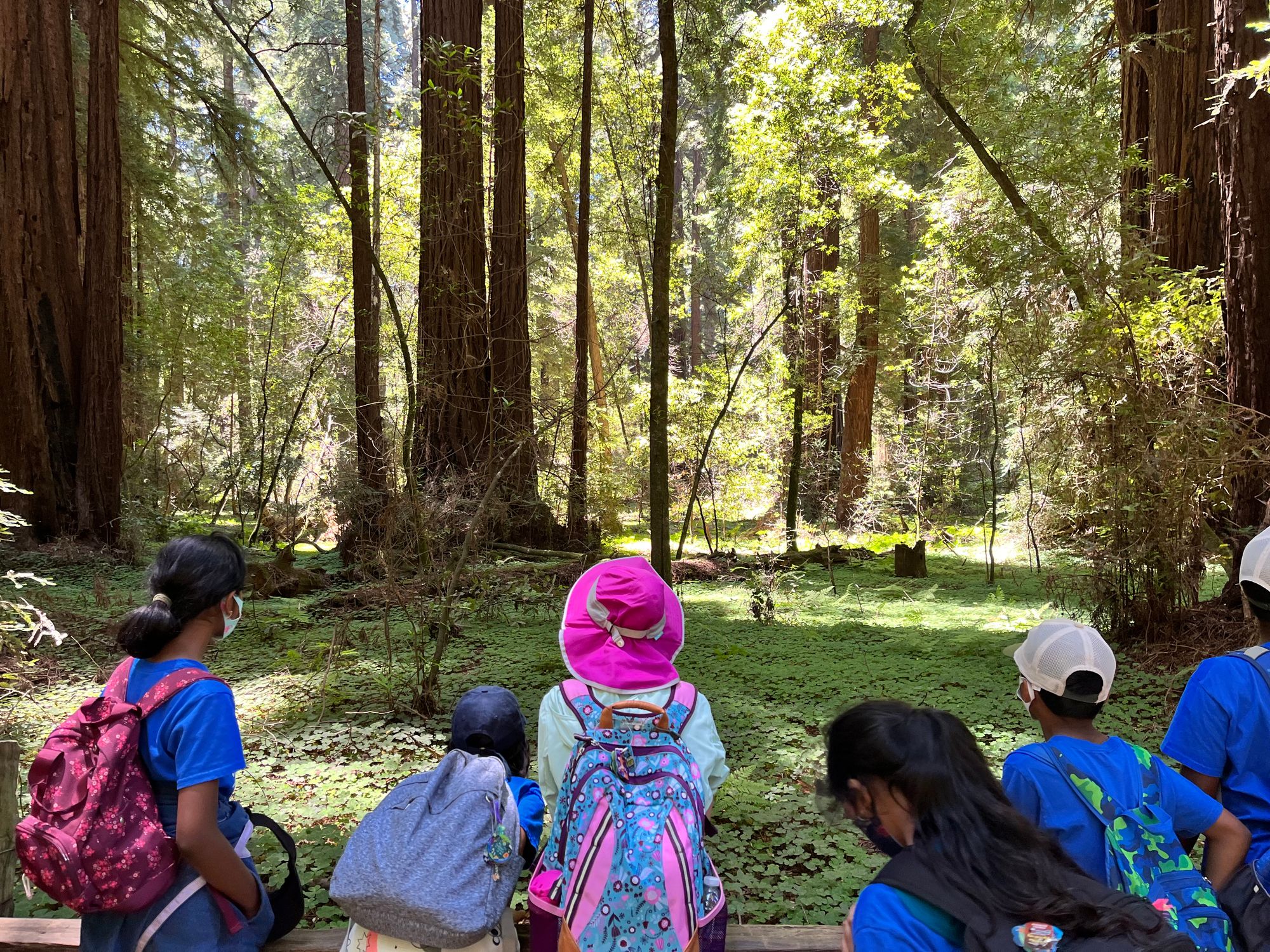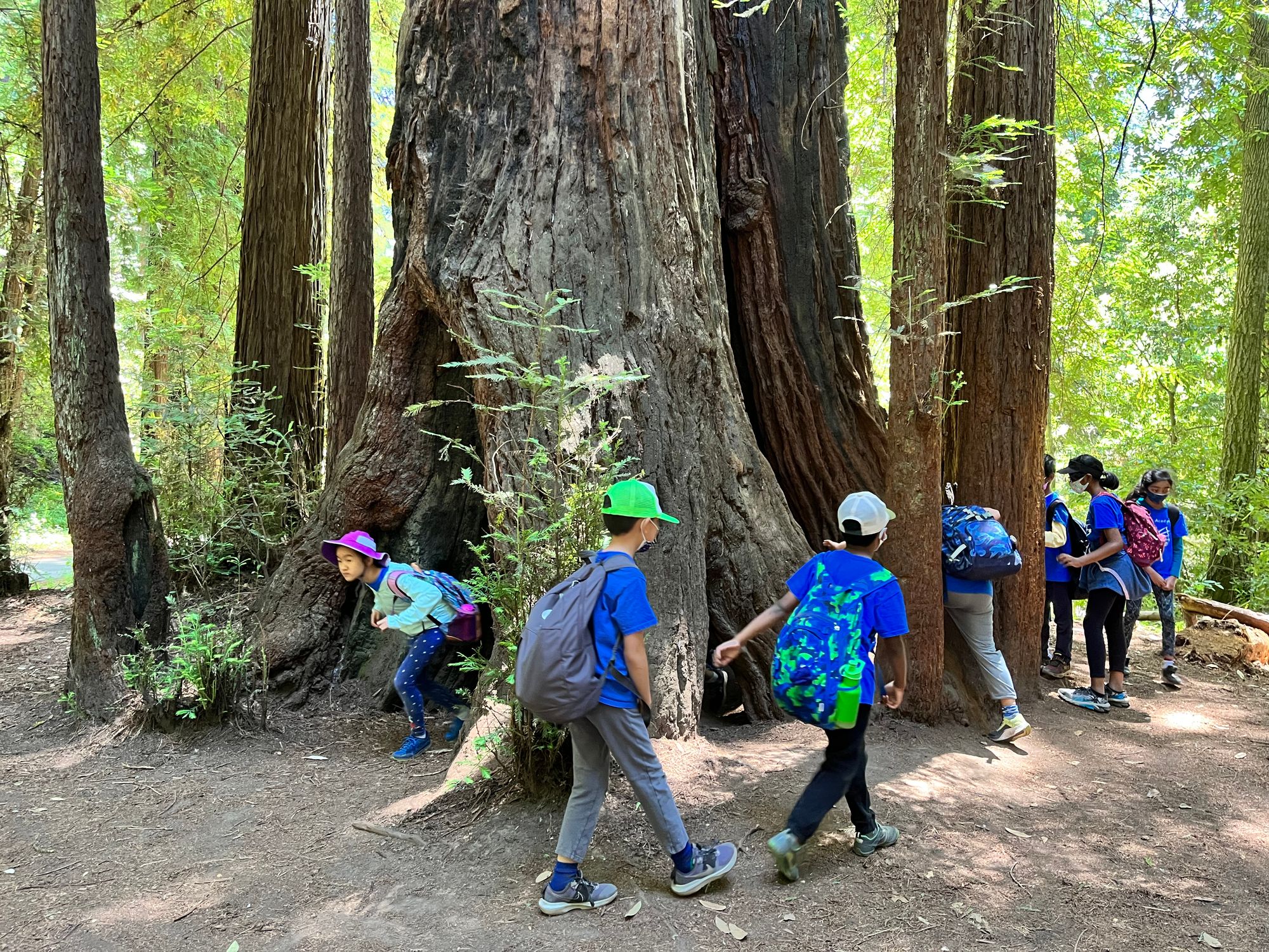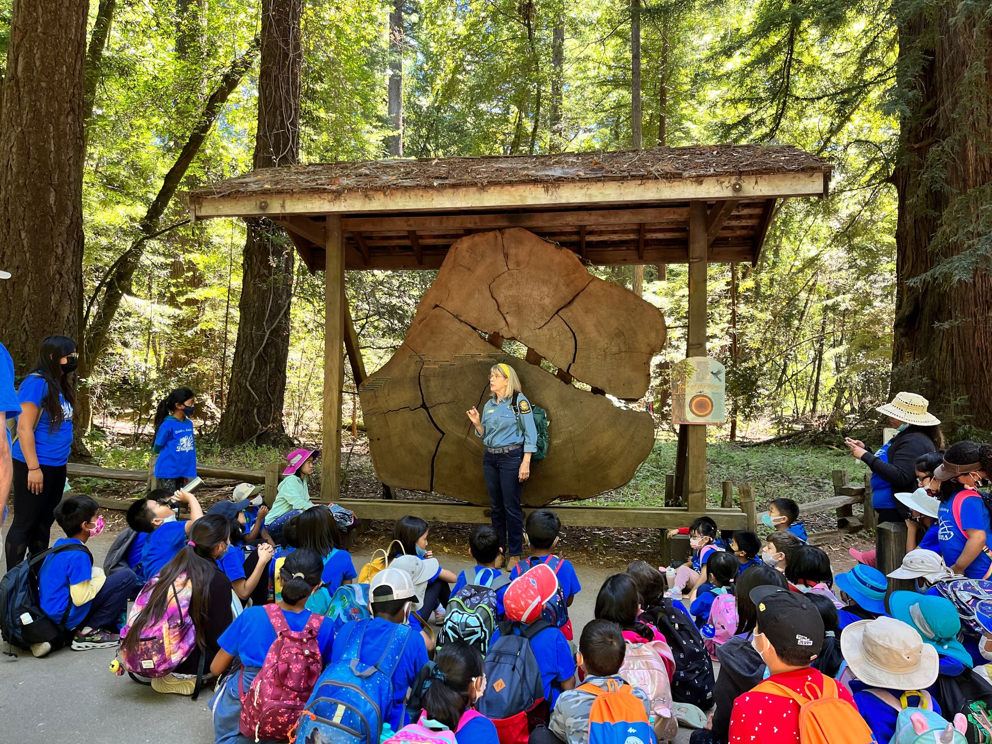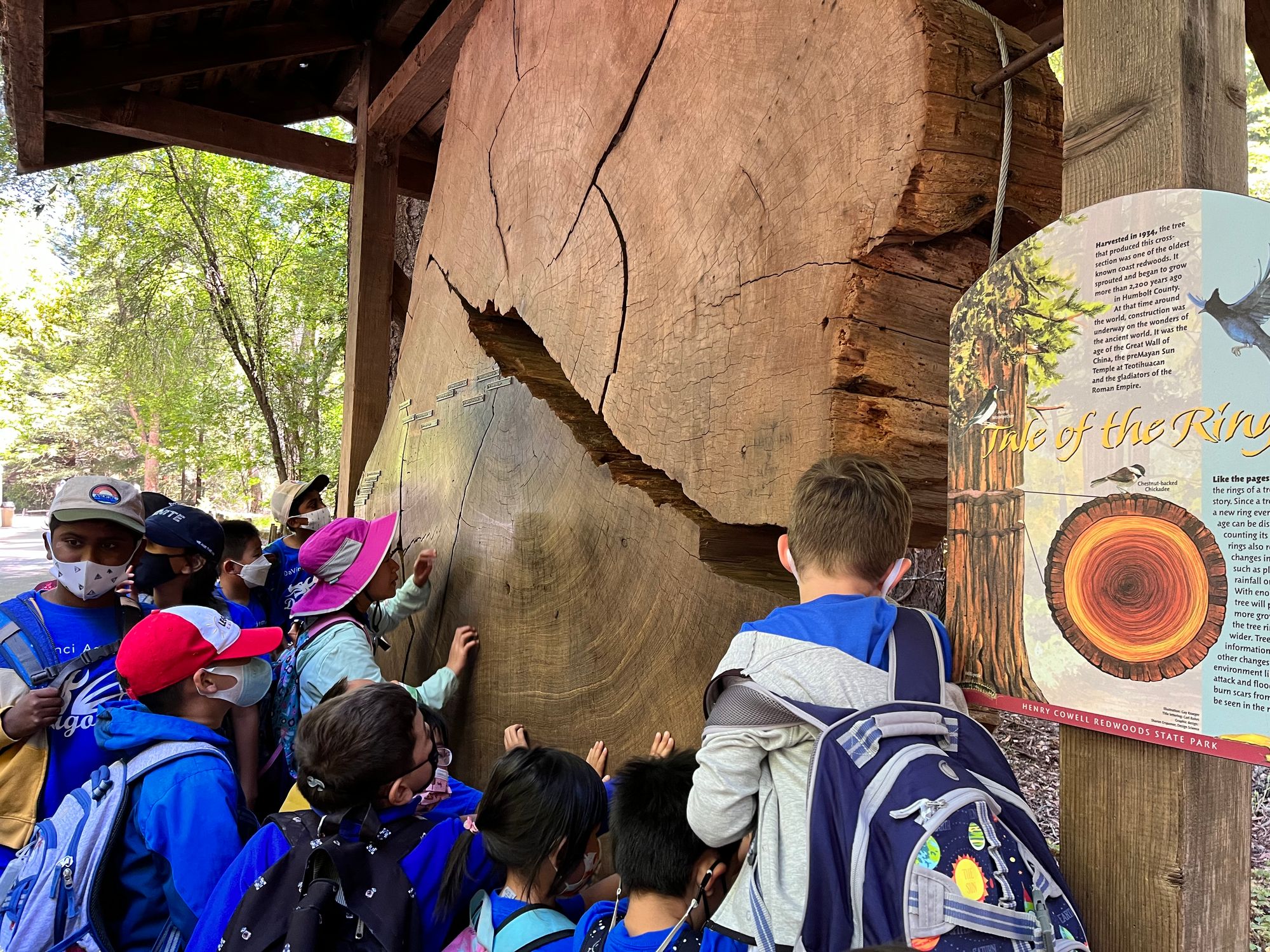 The trip was designed with a combination of learning and exploration. Campers first met a volunteer ranger who talked about a tree in northern California that lived to be 2,200 year old. Campers were able to touch the massive slice of this tree and learned how touching it with the back of the hand allowed them to feel the tiny ridges of each ring with their fingernail. She also told them about the hike they'd be going on, and alerted them to some of the wildlife they could look out for along their walk.