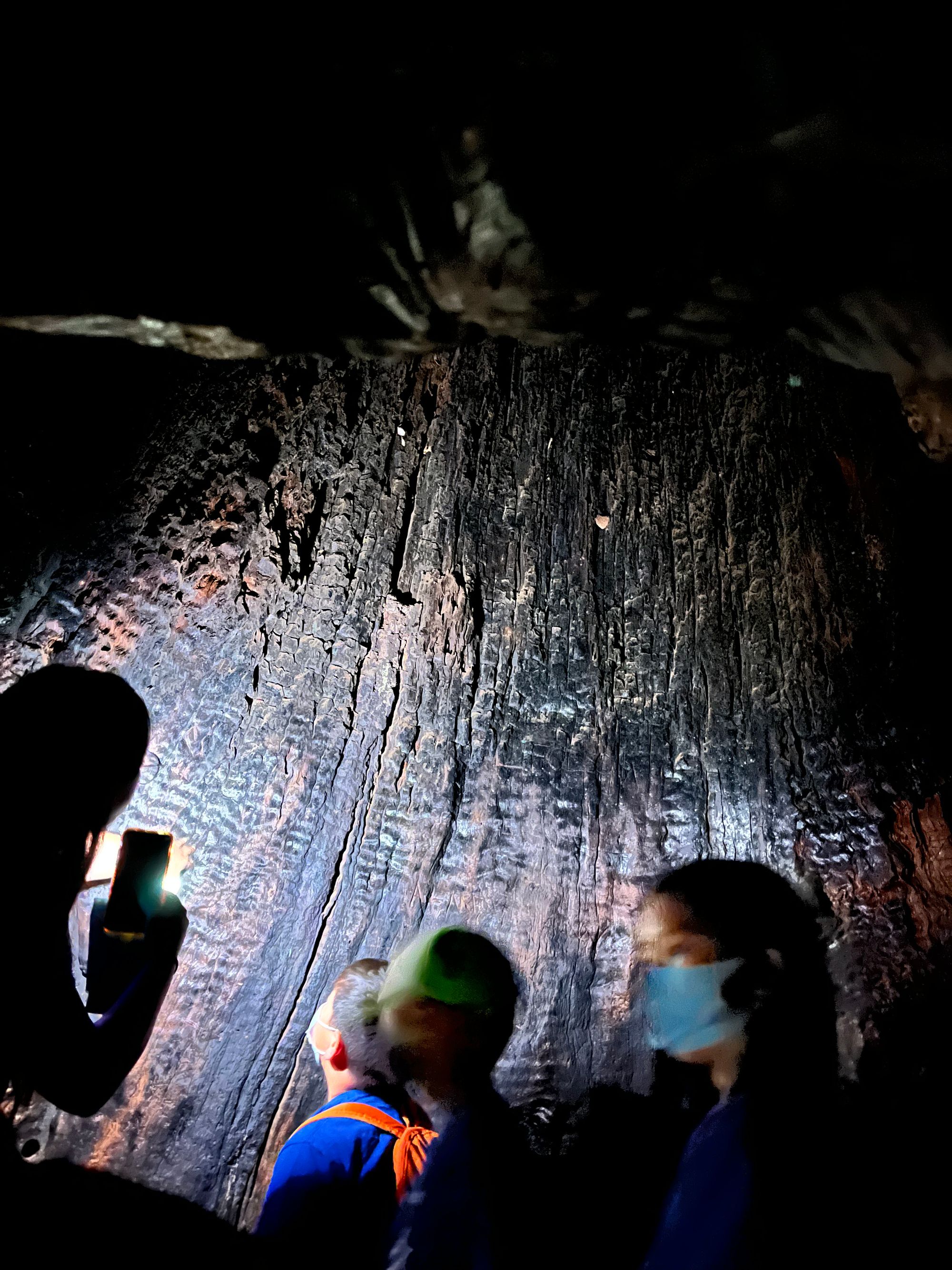 A final highlight was going inside the John C. Fremont tree. This living specimen has a hollow space inside the size of a small room! The record number of people inside that hollow was 86. We entered in several groups of 12-17 people at a time -- much more comfortable. There had been a fire at some point, and the tree had even experienced flames, but the tannins in the redwood bark protected it and it did not burn. Inside, however, the walls were darkened. A volunteer ranger explained that it was rumored that John C. Fremont (and possibly Kit Carson) had slept there during a storm when first mapping the west. The space had also once had beds put in it as a special room for the resort that had once existed there.