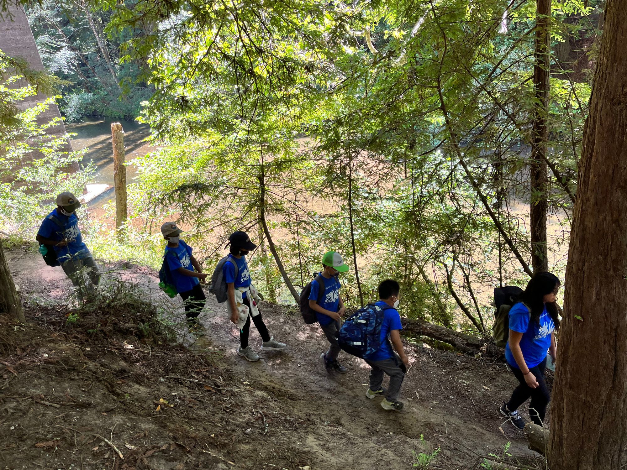 Then it was time for the hike – in this case, a roughly one mile loop with numbered stops along the way where campers learned more about specific types of trees or habitats at that site.